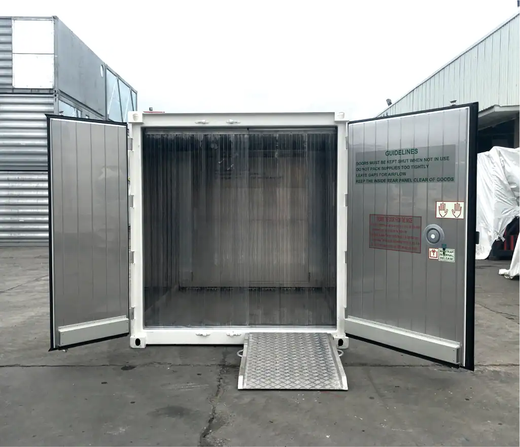 El box cuenta con un alto valor aislante, piso de aluminio antideslizante, cortinas corredizas de PVC para minimizar la pérdida de frío mientras se trabaja dentro del mismo, luz interna y rampa para fácil ingreso. Asimismo, las puertas poseen sistemas de apertura simple y la posibilidad de abrirlas desde adentro, como así también alarma en caso de que alguna persona quede atrapada en la cámara.